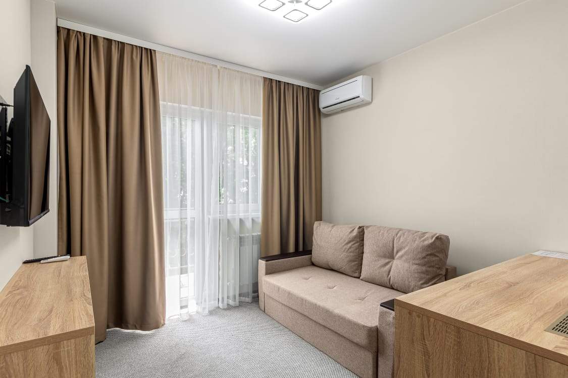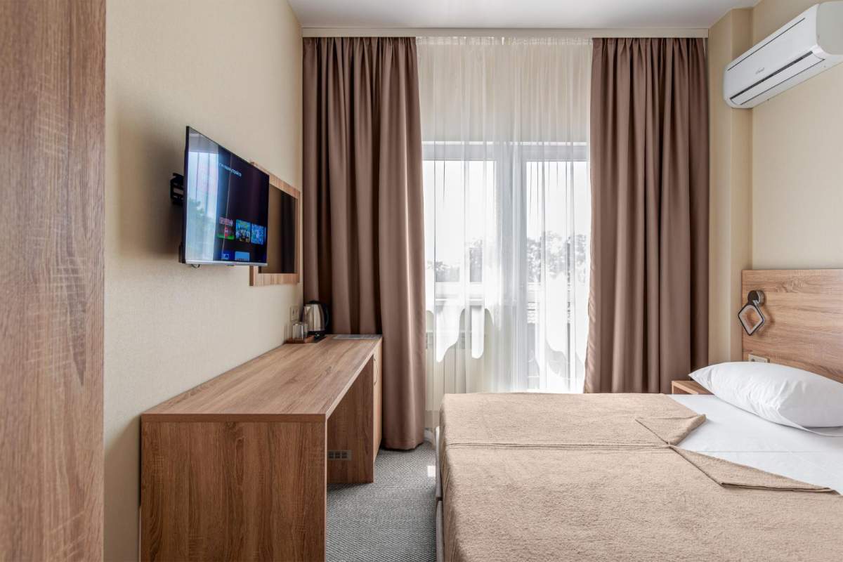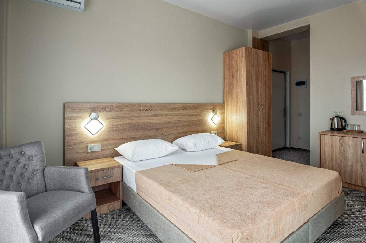 В номере: совмещенный санузел, односпальная/двуспальная кровати, шкаф, прикроватные тумбочки, журнальный столик, вешалка, сплит-система, холодильник, телевизор, эл. чайник, посуда. Номера с балконом доплата 5000 за номер.